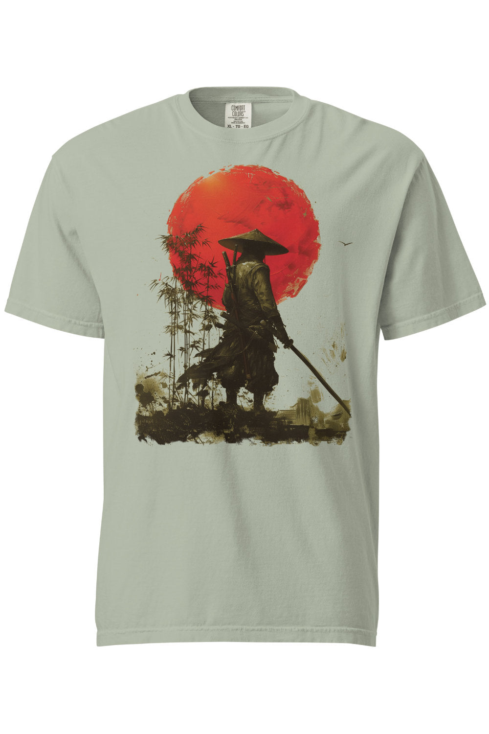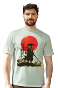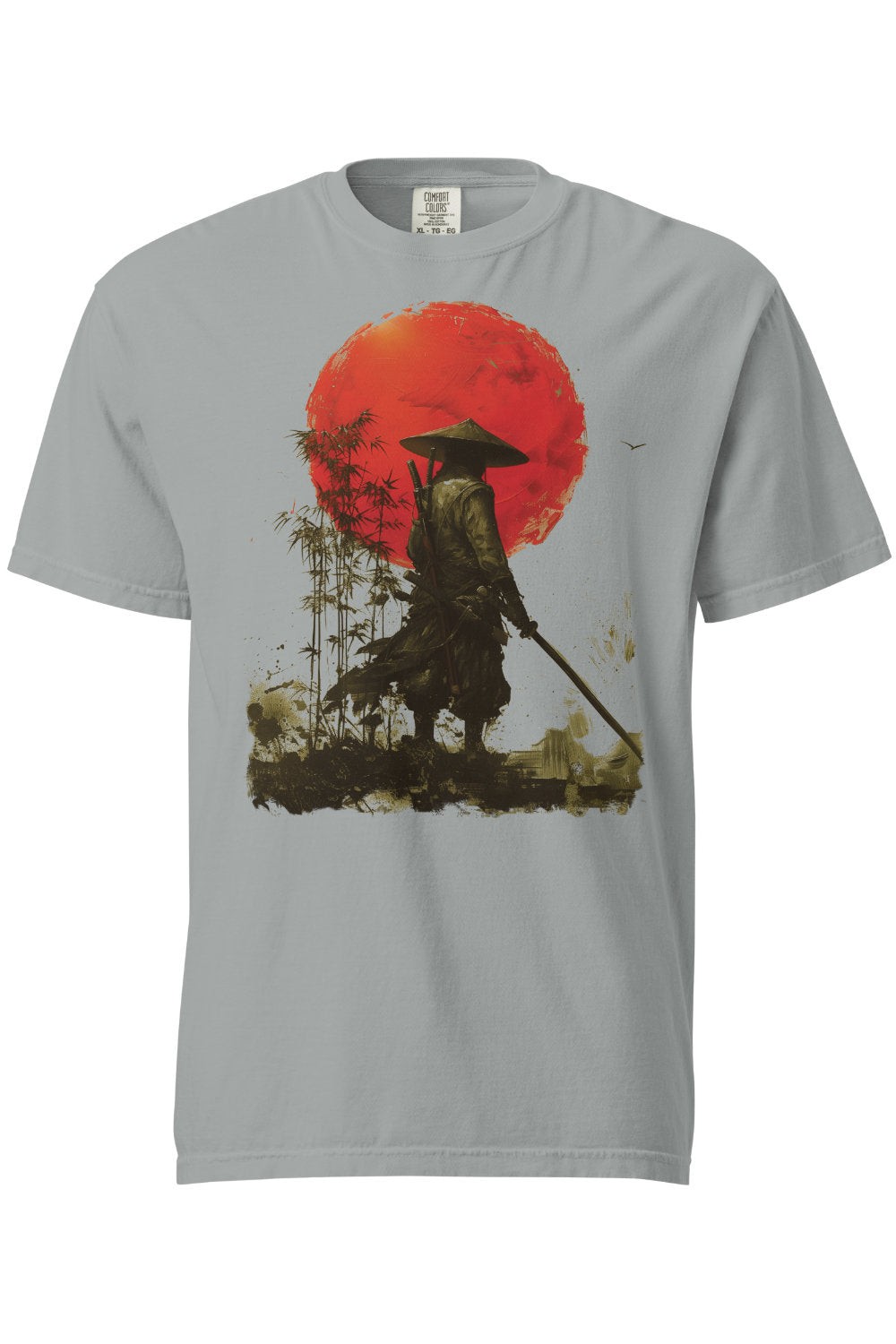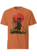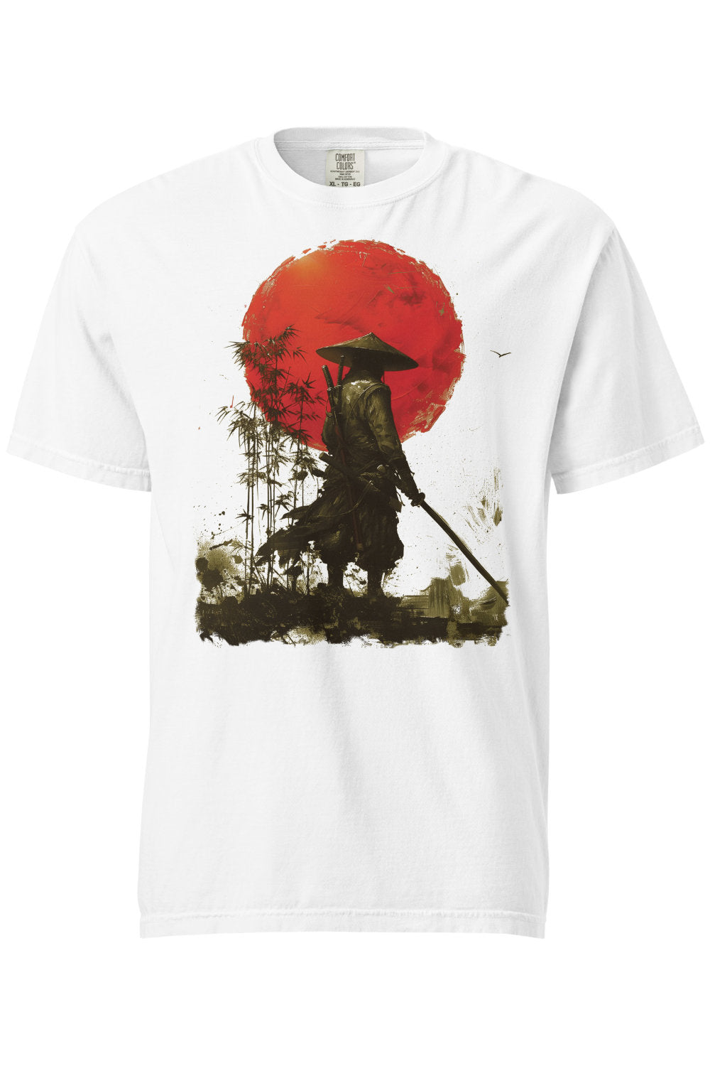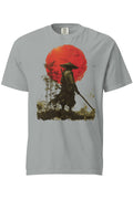 A striking, stylized a lone samurai t-shirt facing set against a large, vivid red sun in the background and painted in black ink-like strokes. Splashes of black and gray paint form a textured, abstract background, while the red sun stands out with intense color. Designed with a relaxed fit and a streetwear edge, it’s perfect for everyday wear.