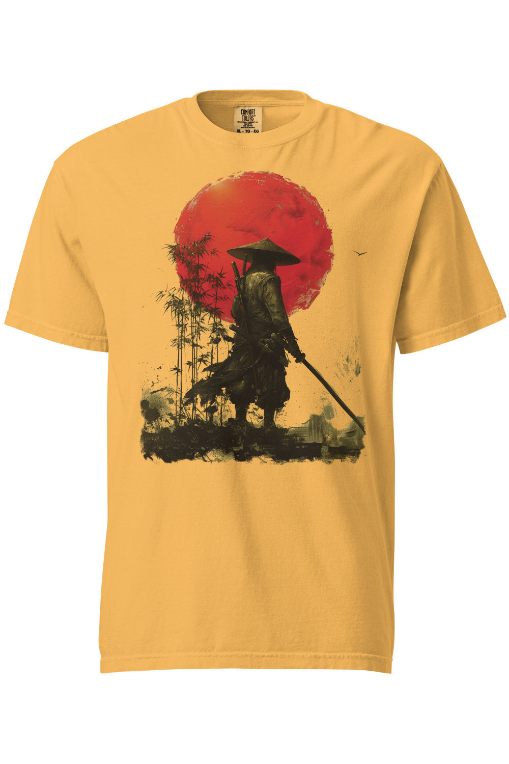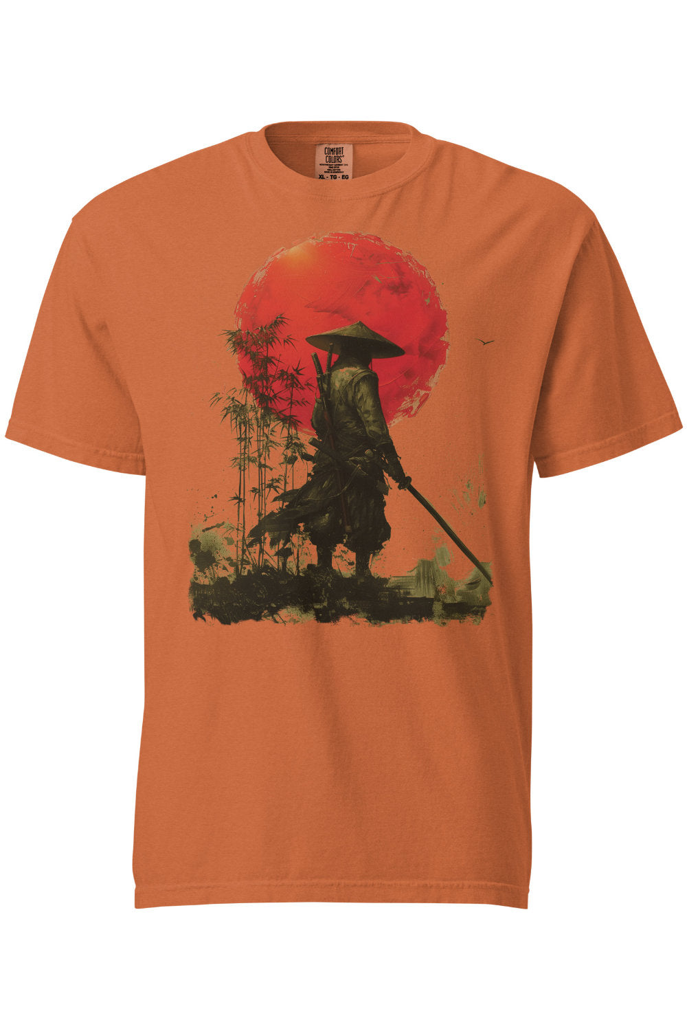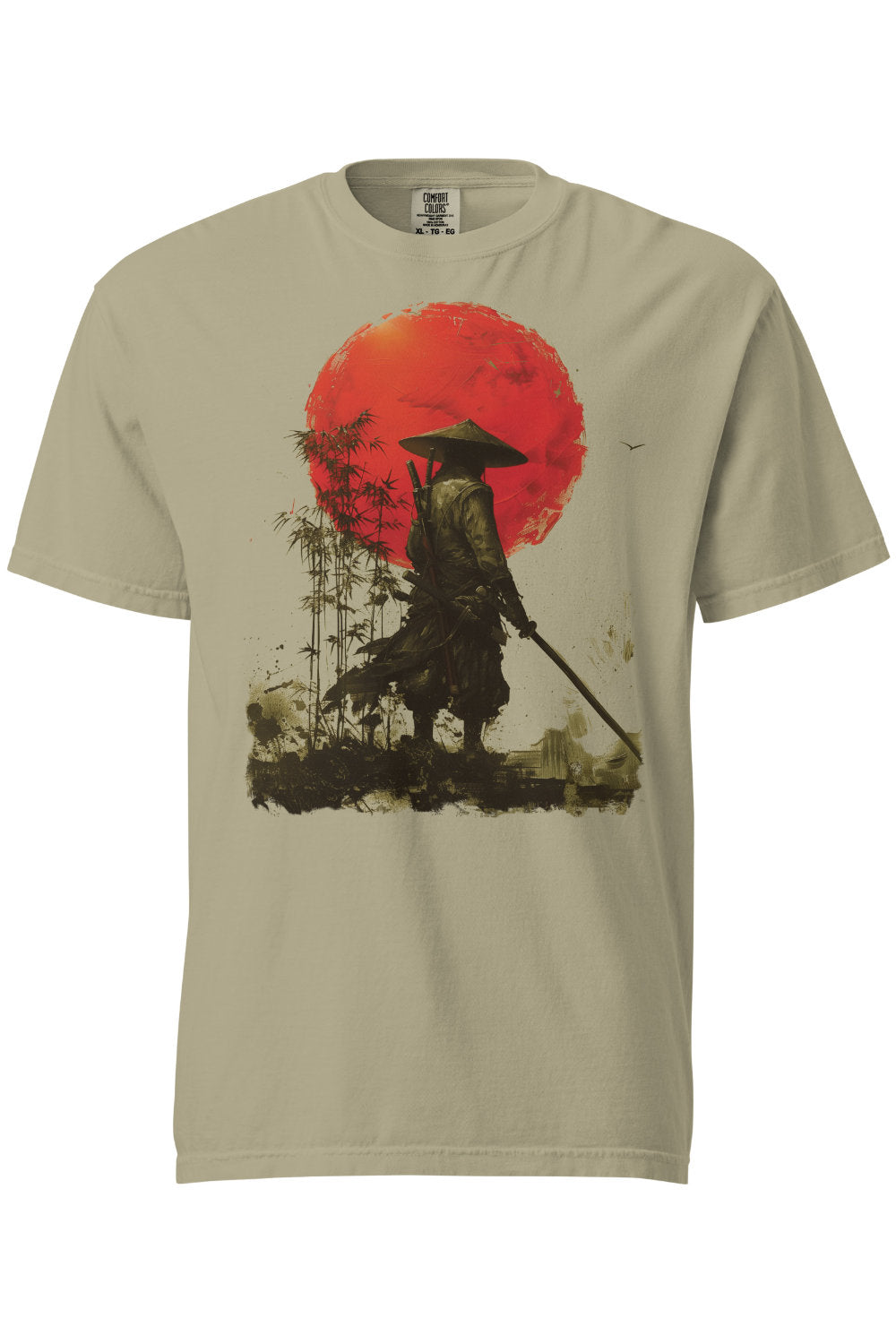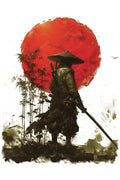 A striking, stylized a lone samurai t-shirt facing set against a large, vivid red sun in the background and painted in black ink-like strokes. Splashes of black and gray paint form a textured, abstract background, while the red sun stands out with intense color. Designed with a relaxed fit and a streetwear edge, it’s perfect for everyday wear.