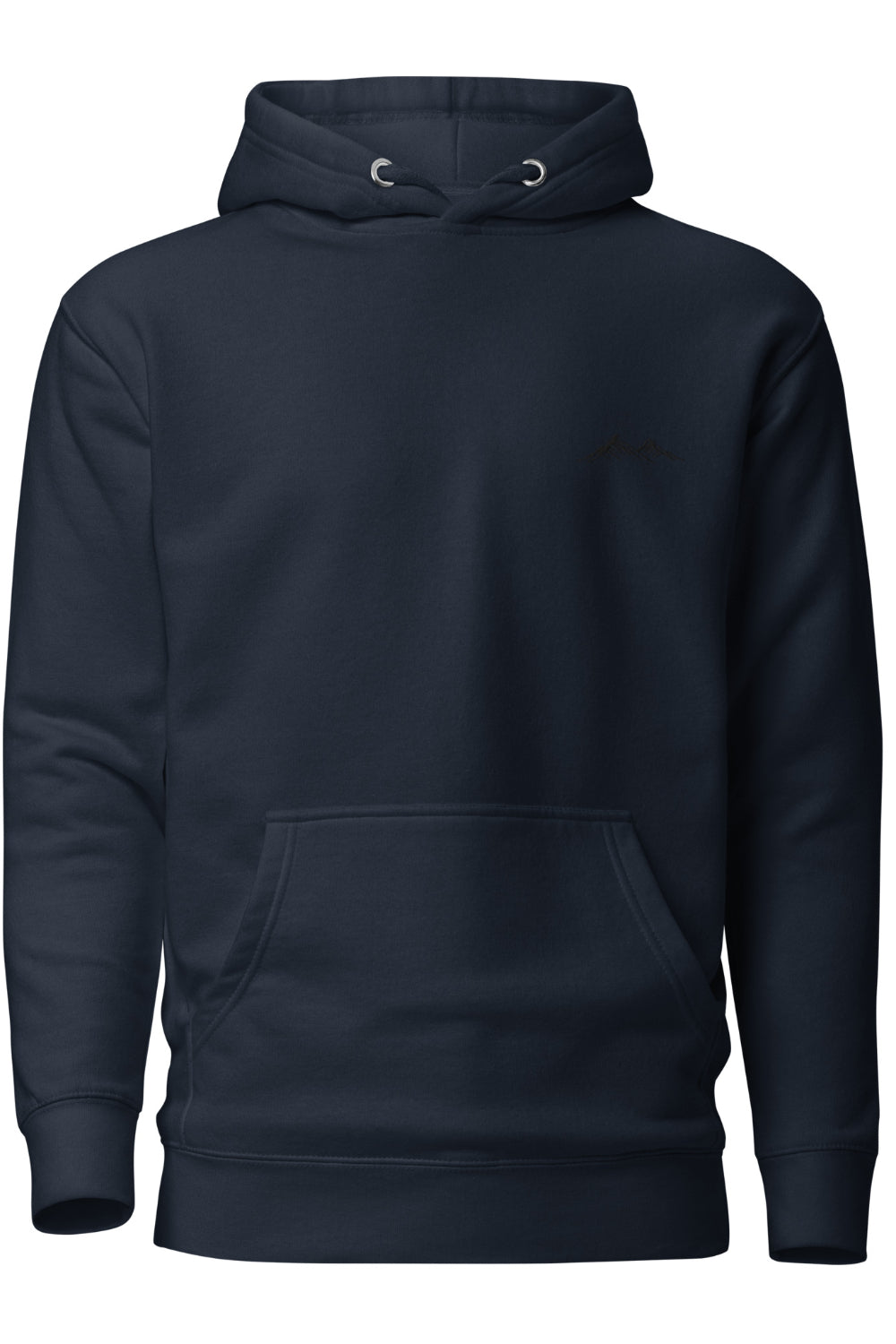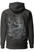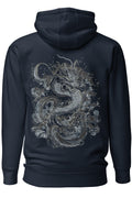 No fire. No gold. Just a coiled force printed in cool greys and blue, stretched across the back of soft, heavyweight navy cotton.