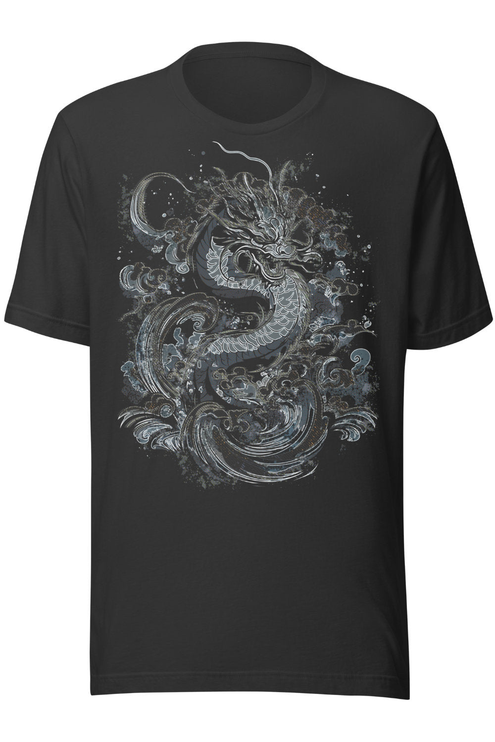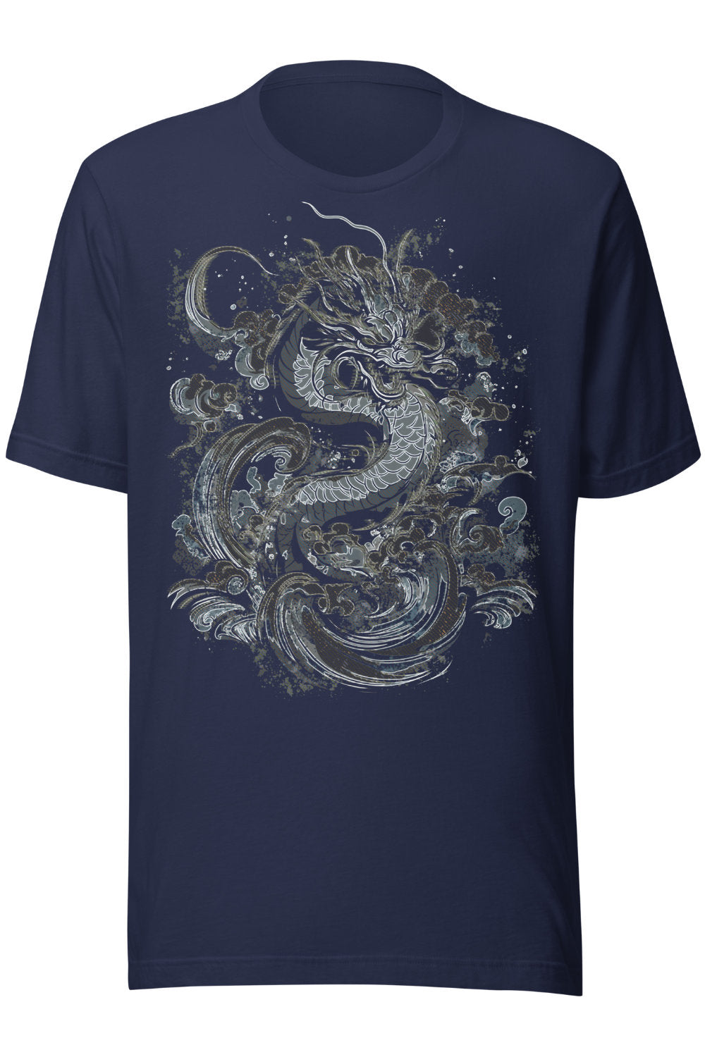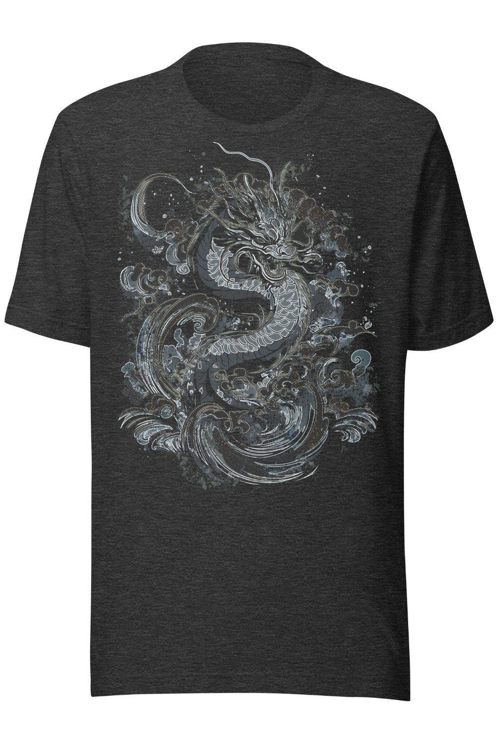 This t-shirt features a detailed linework illustration of a dragon moving through swirling waves. The design is printed in cool, muted blues and greys that stand out well on darker fabric options like vintage black, navy, or heather tones. The shirt itself has a classic, semi-fitted look and soft cotton feel, easy to wear on its own or layered.
