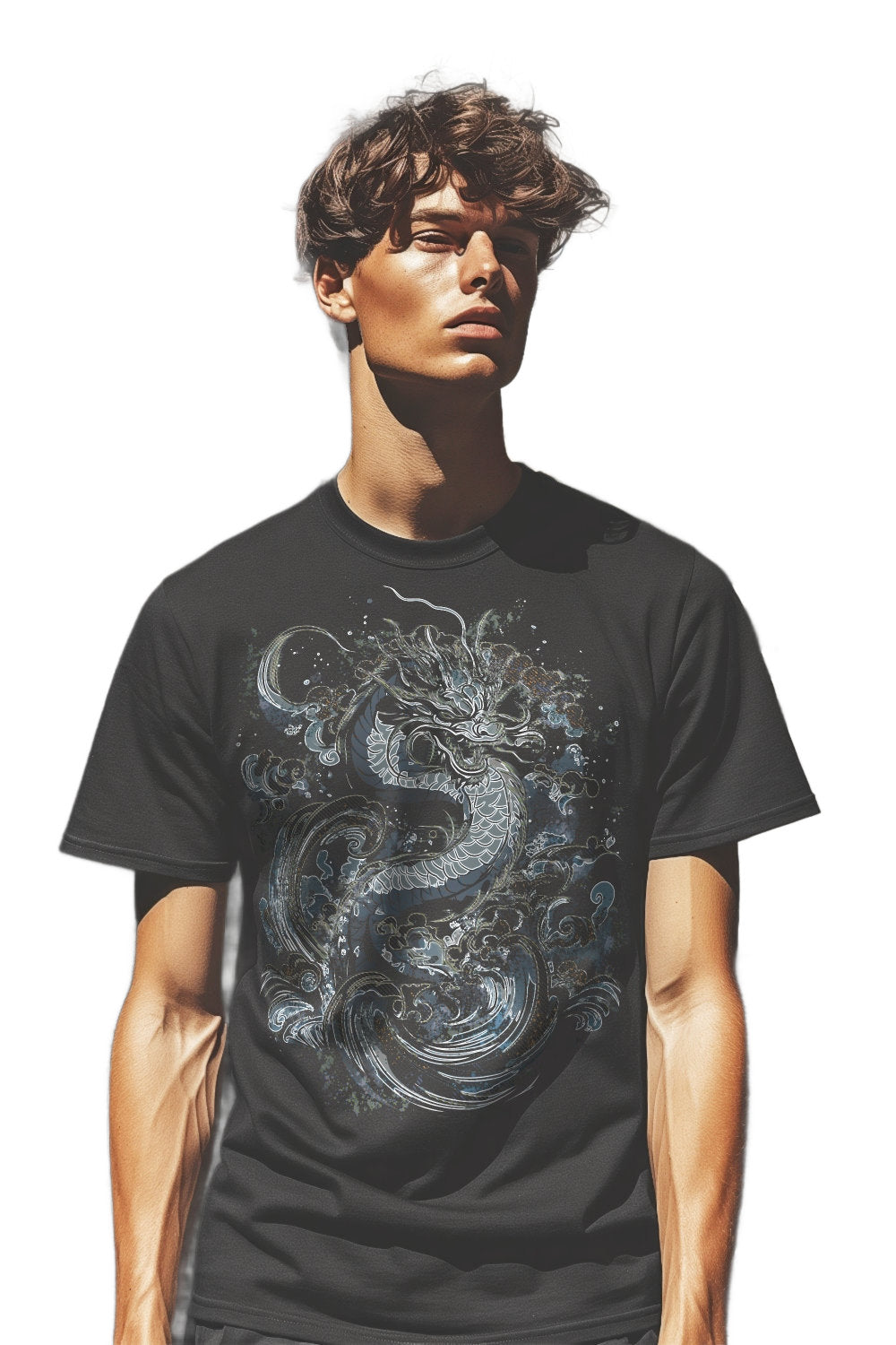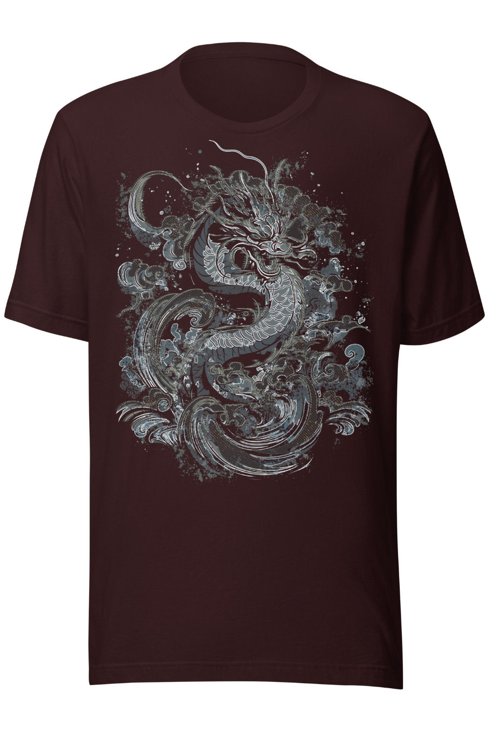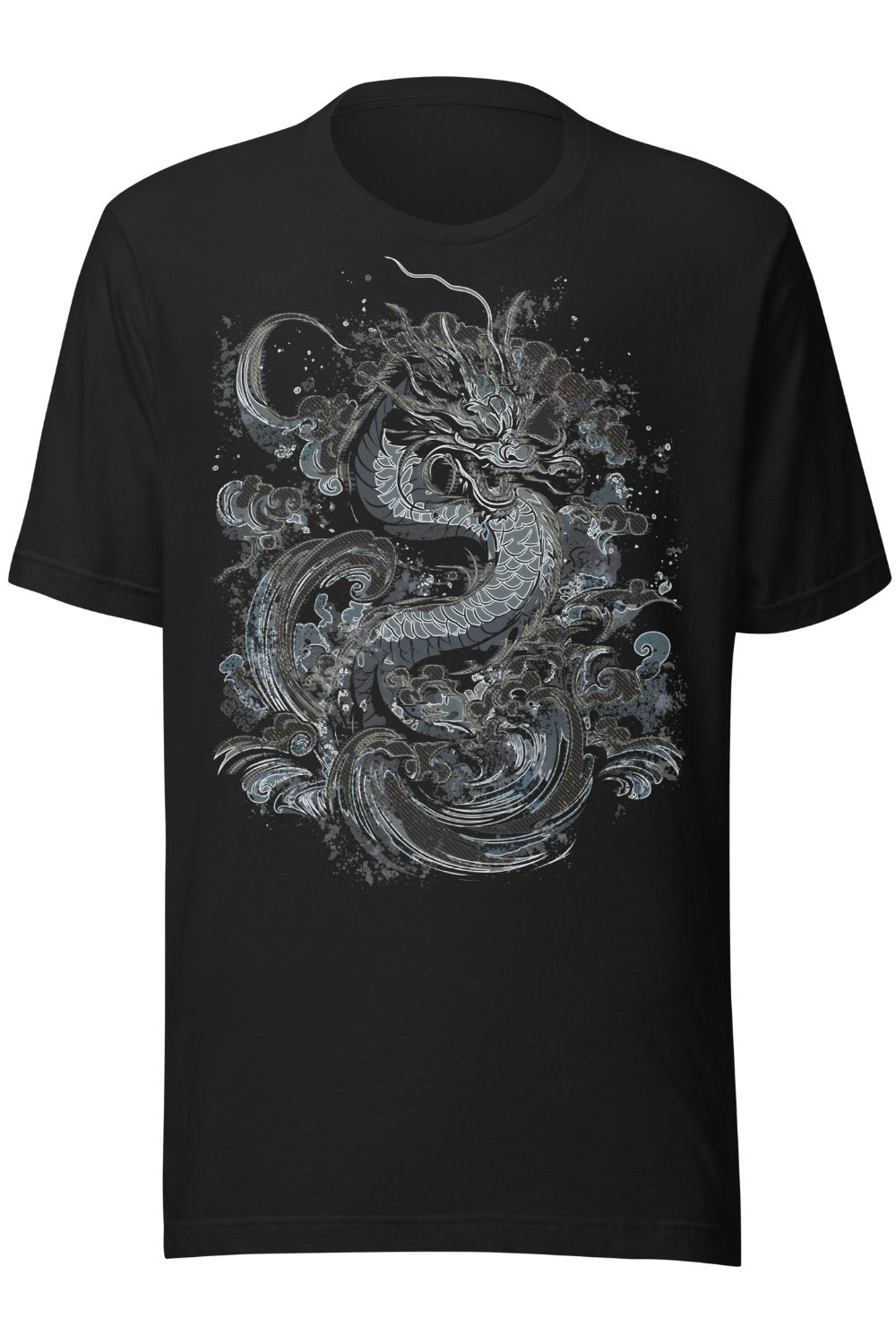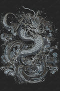 This t-shirt features a detailed linework illustration of a dragon moving through swirling waves. The design is printed in cool, muted blues and greys that stand out well on darker fabric options like vintage black, navy, or heather tones. The shirt itself has a classic, semi-fitted look and soft cotton feel, easy to wear on its own or layered.