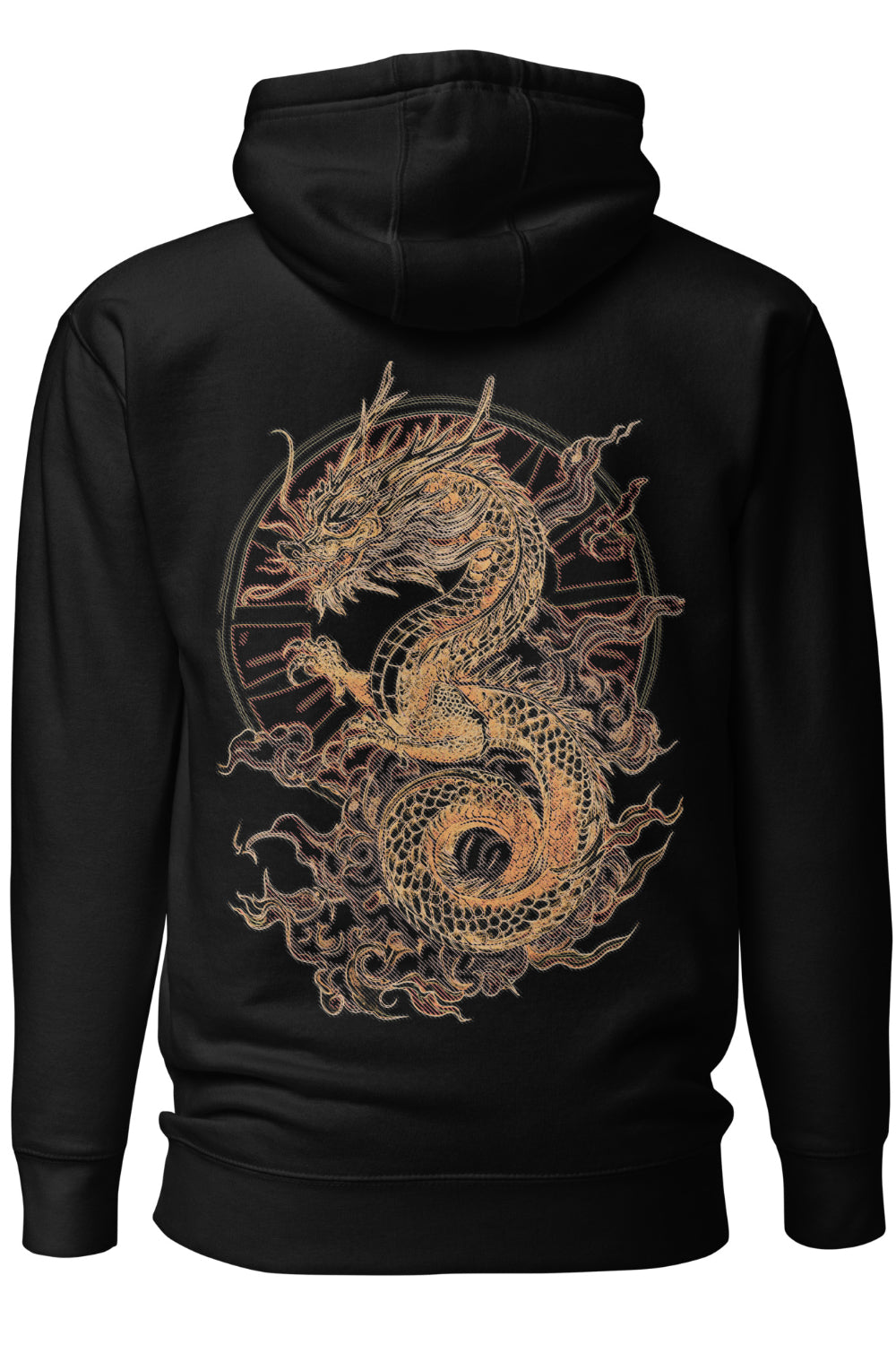 This Golden Dragon printed hoodie hits like something found, not made. Drawn in fine gold lines, the artwork is tight, deliberate, and wrapped in heat.