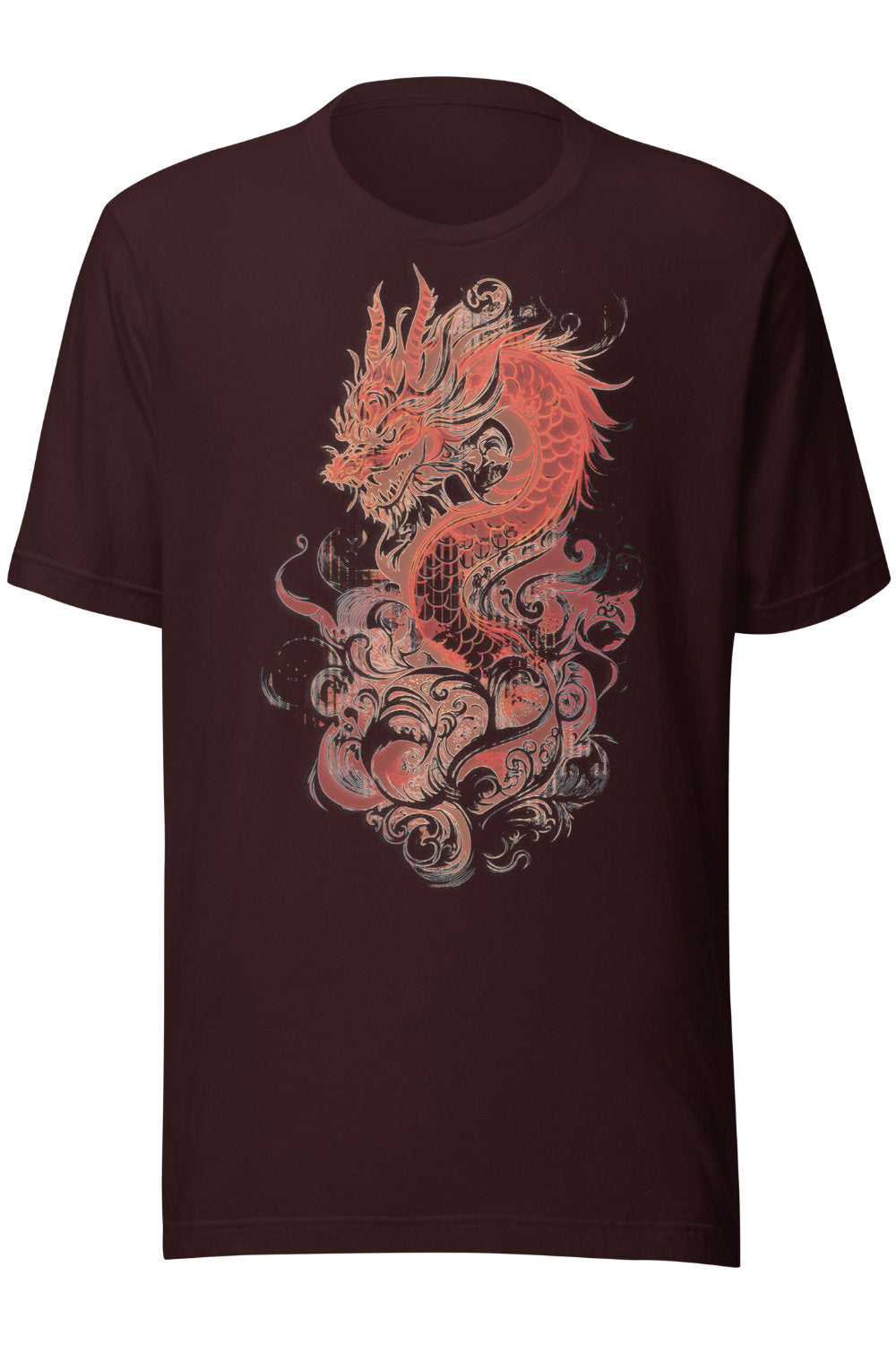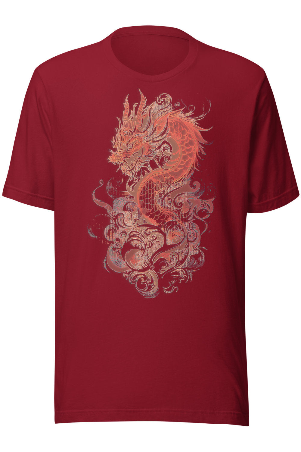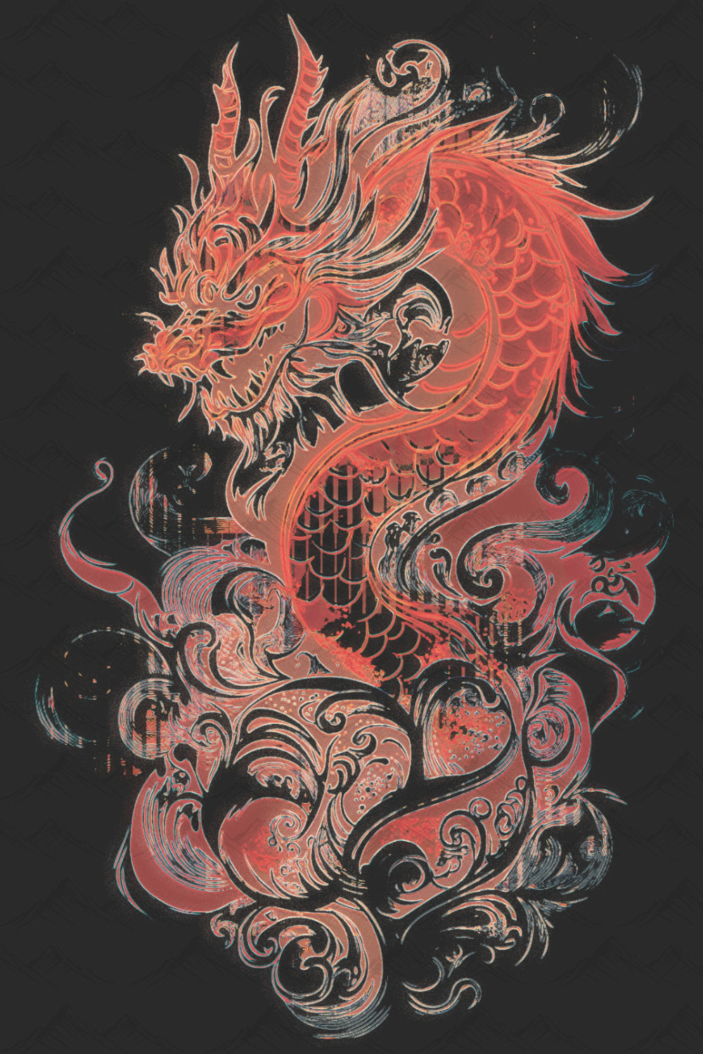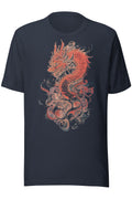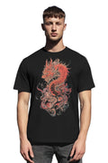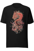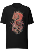 A detailed red dragon wrapped in motion, with bold lines and layered textures. Sharp, fluid, and full of energy without feeling overdone. Printed on black for maximum contrast.