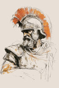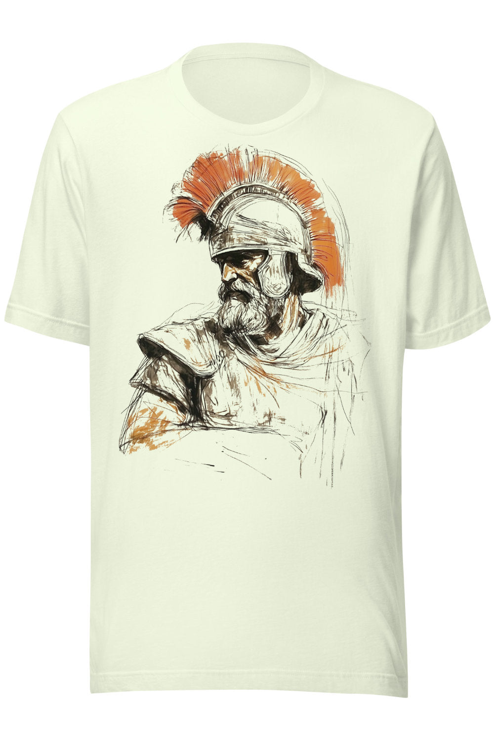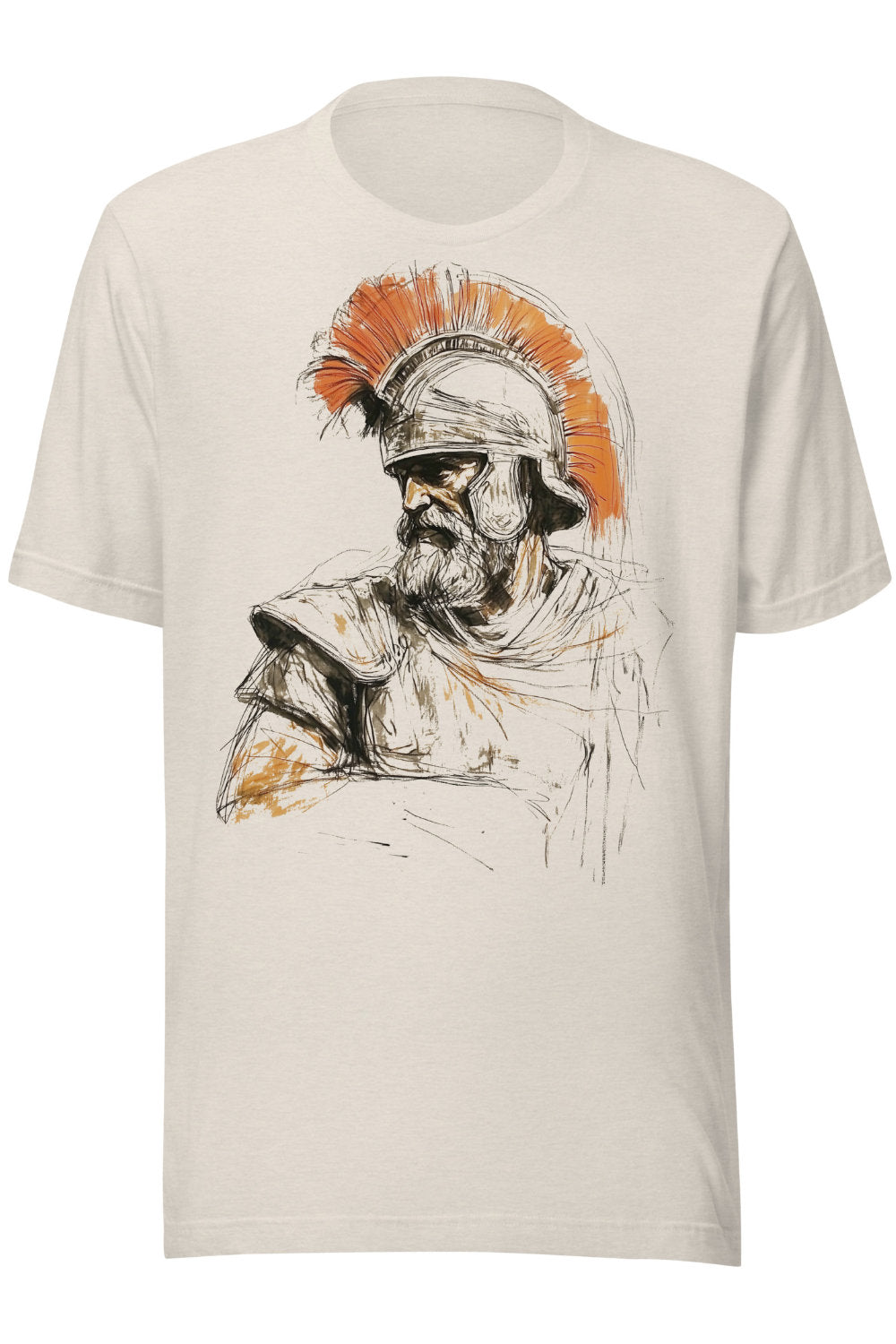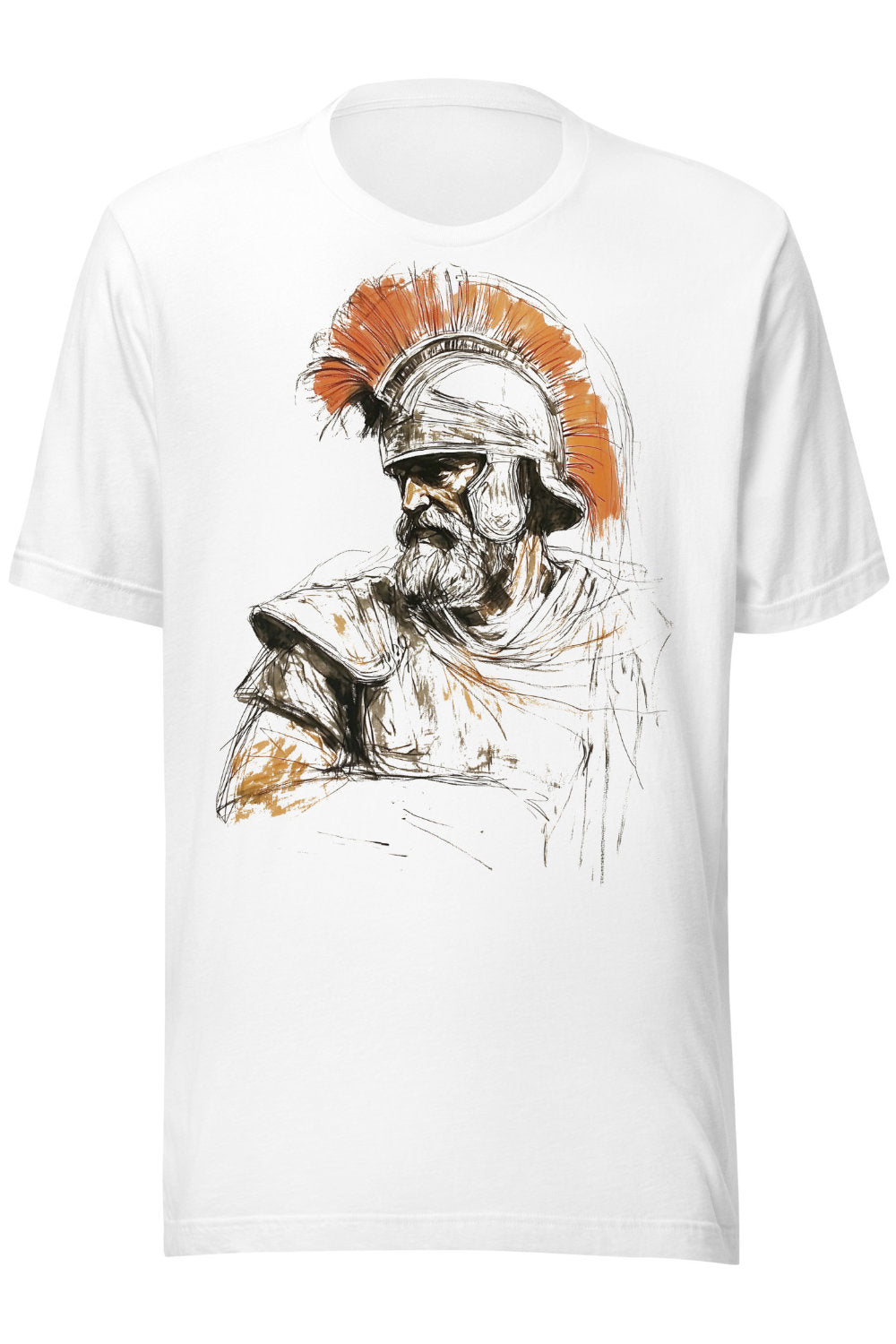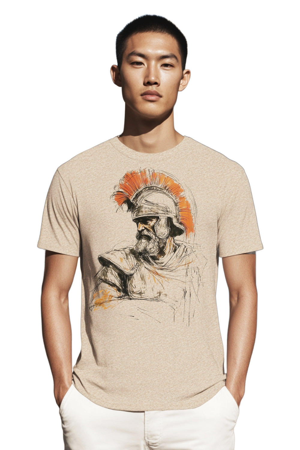 A striking t-shirt featuring a commanding Roman general, with his helmet accented by vivid red-orange tones. The strong linework and shading bring out his rugged power, making it the perfect choice for anyone who appreciates historical or warrior-themed designs.