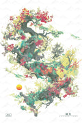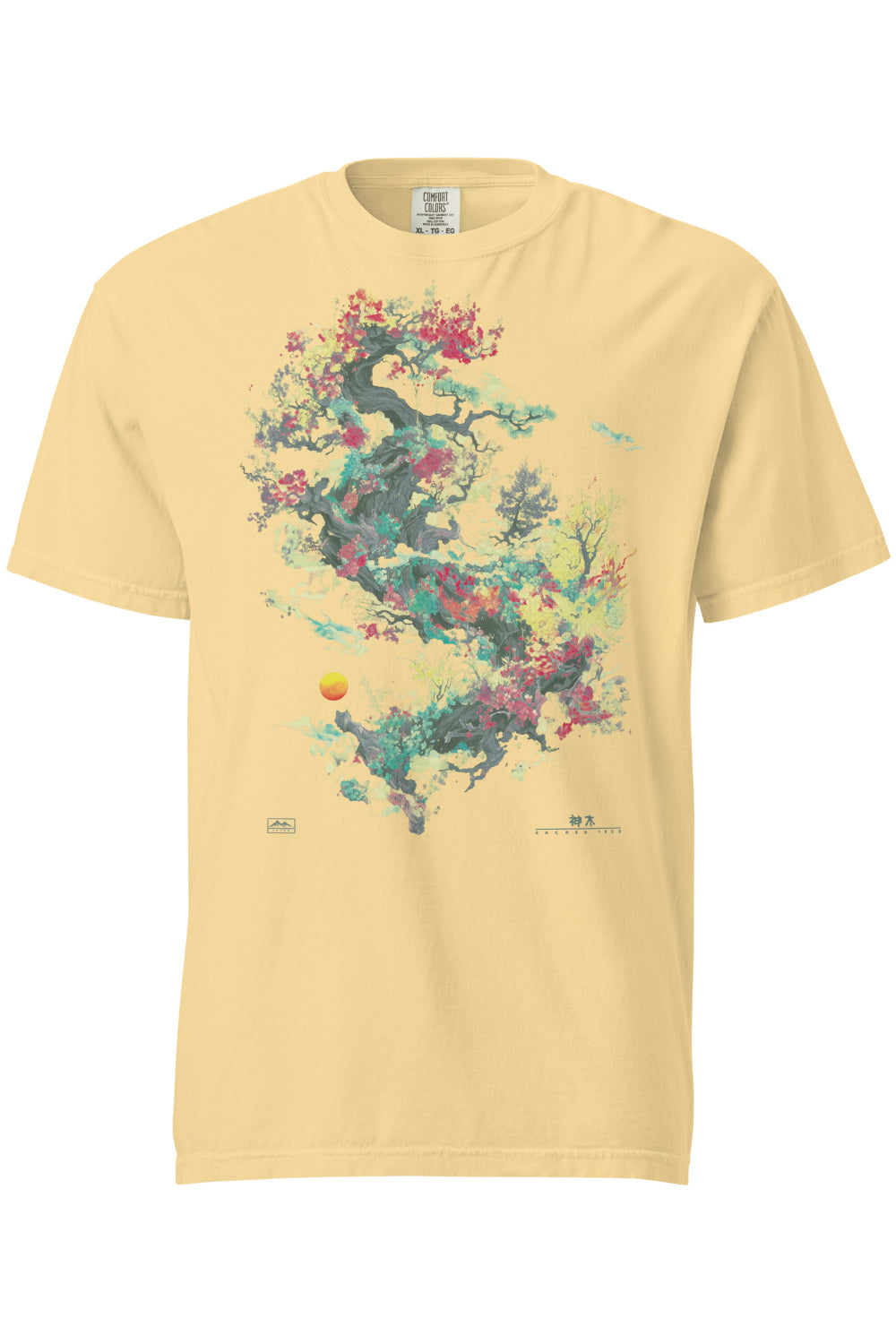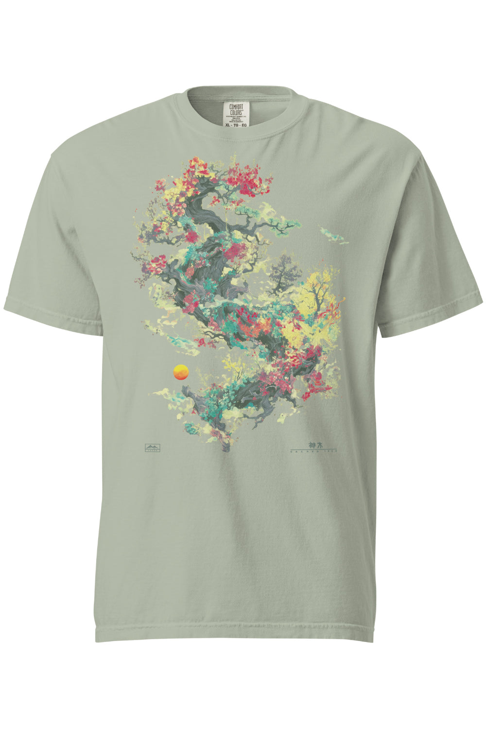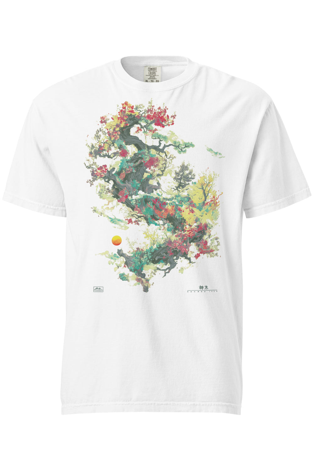 A twisting, layered tree made up of blooming branches in bold reds, soft yellows, and deep greens. Some say a gentle and wise spirit lives in it.