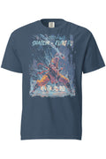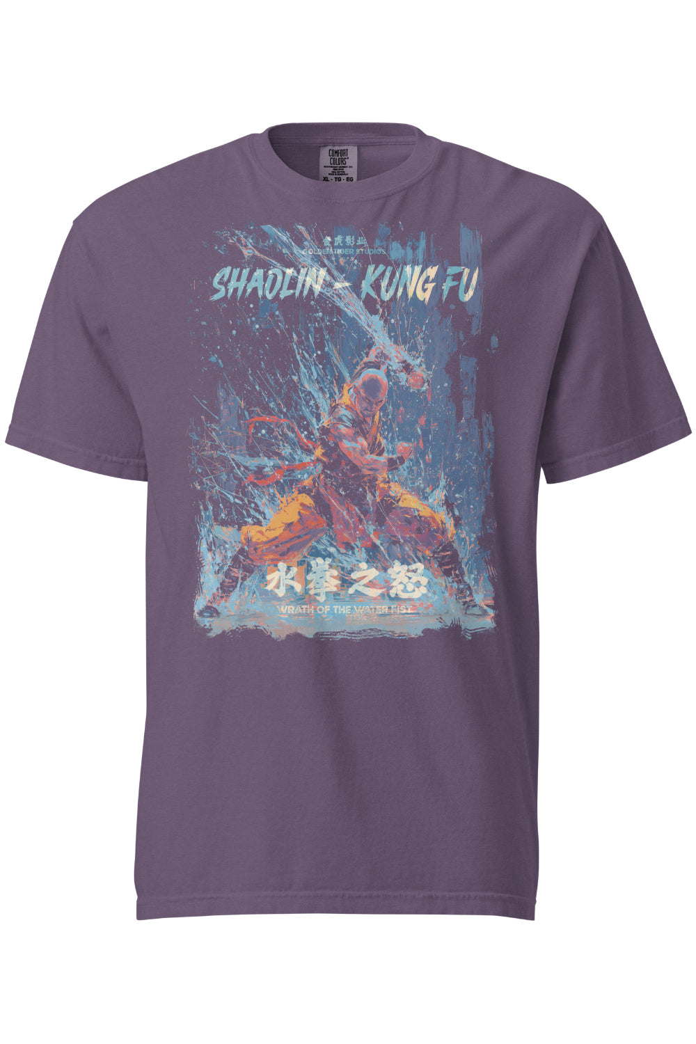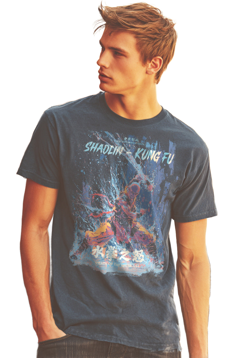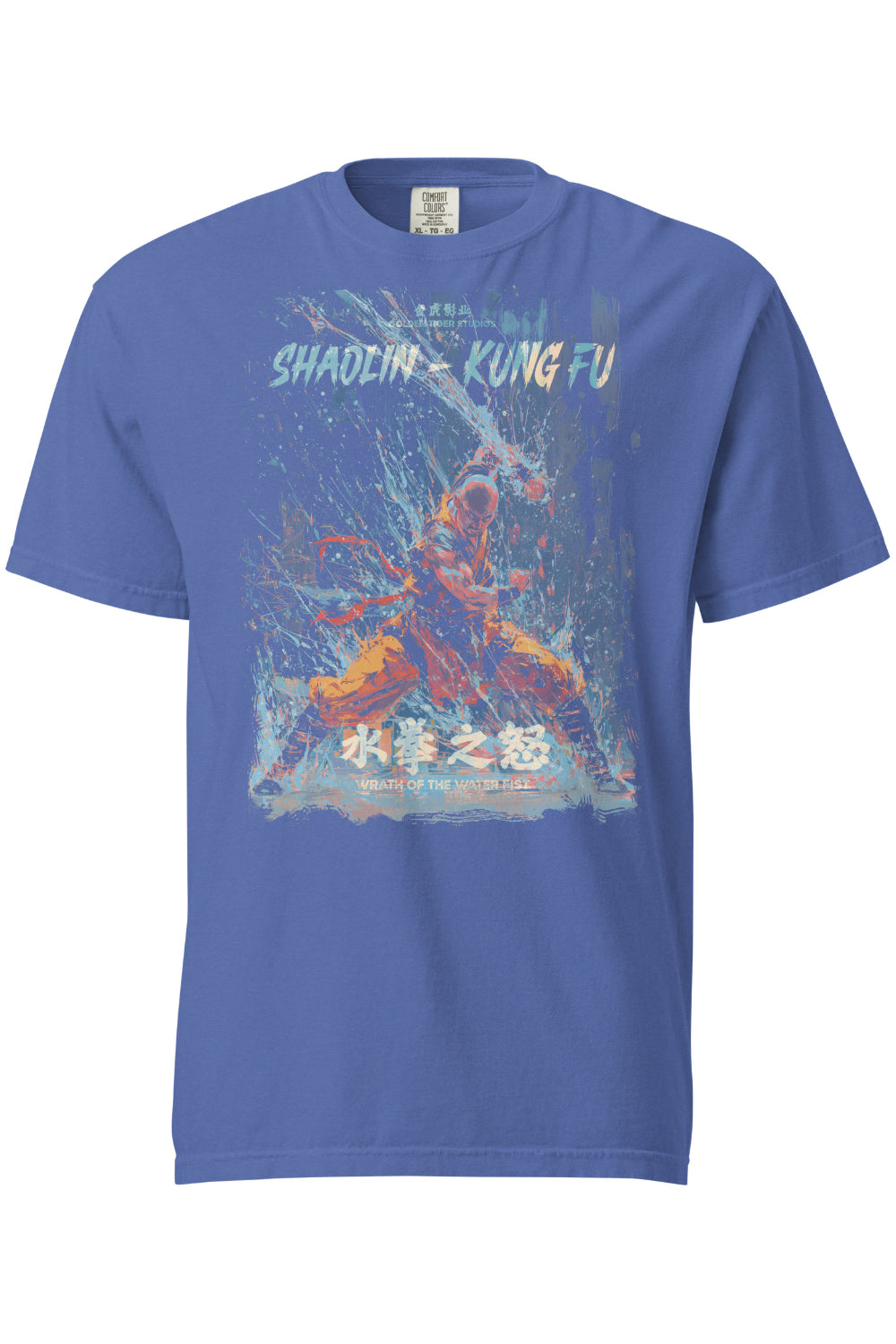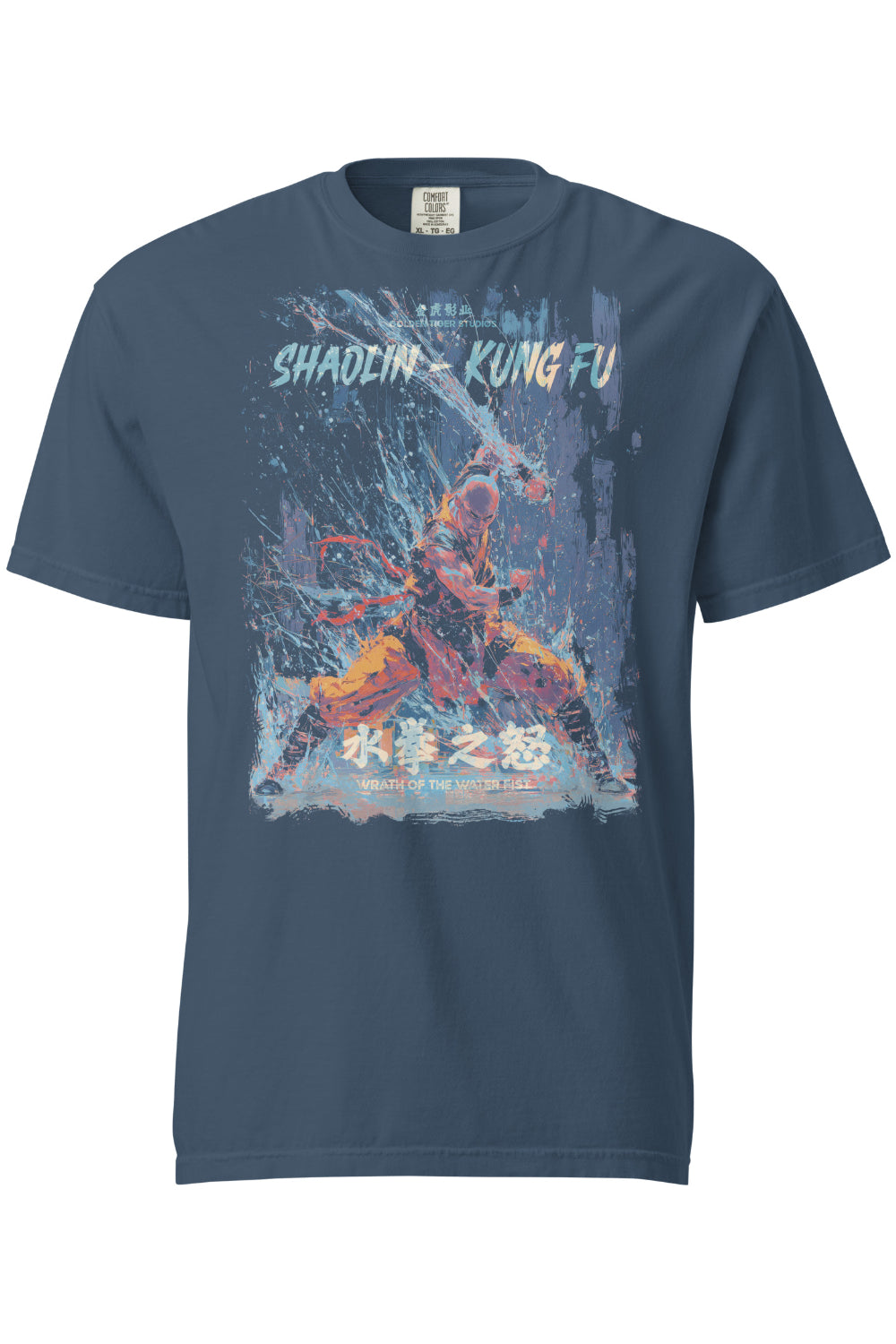 Unleash the storm with our high-energy “Wrath of the Water Fist” t-shirt. This one hits like a kung fu movie poster: an explosive Shaolin warrior mid-strike, framed by crashing waves and raw momentum. The artwork blends gritty textures with vivid energy, set off beautifully against mystic blue fabric (or go for grape, brick, denim, or midnight if you’re feeling a different vibe).