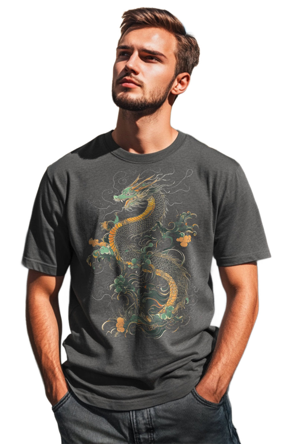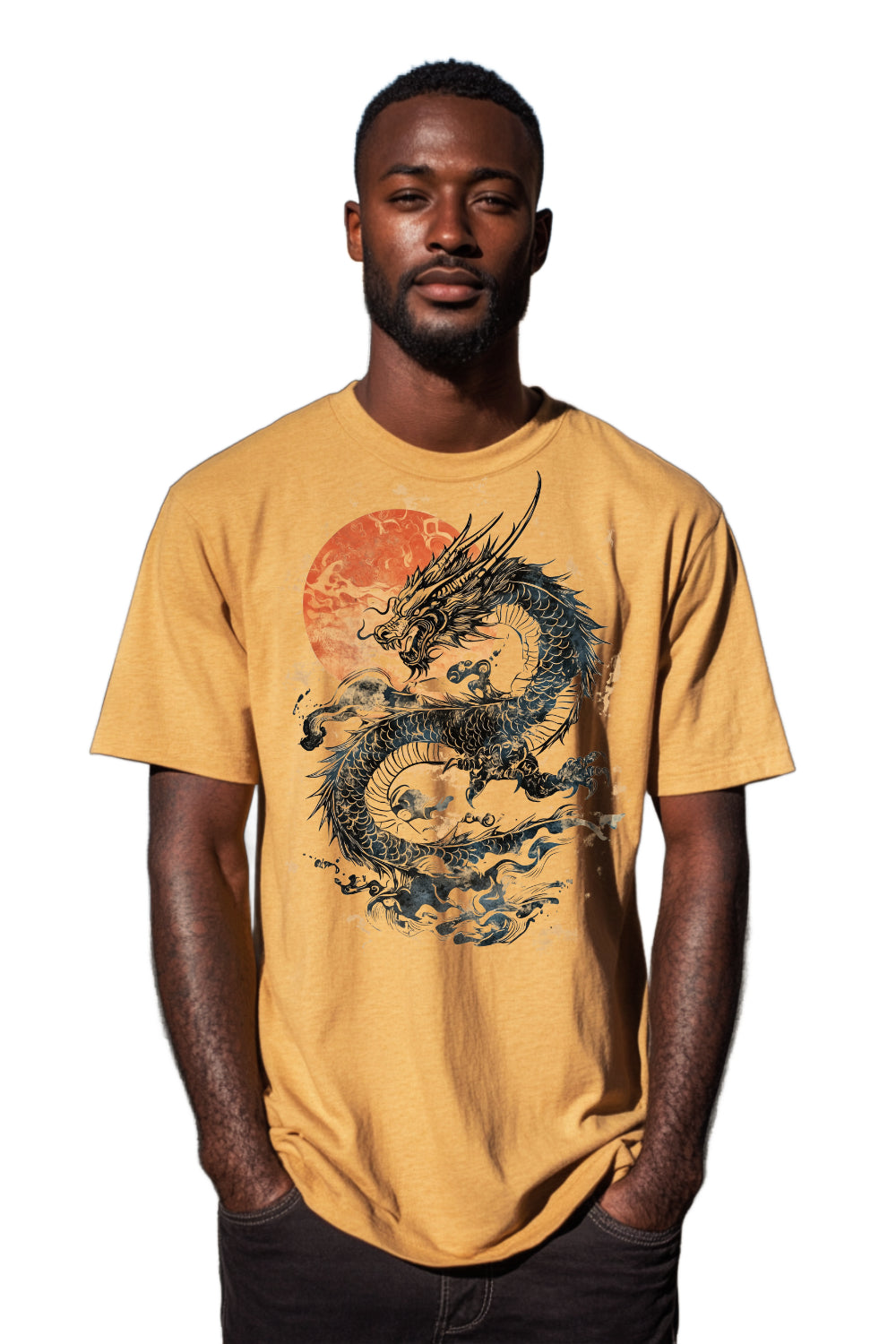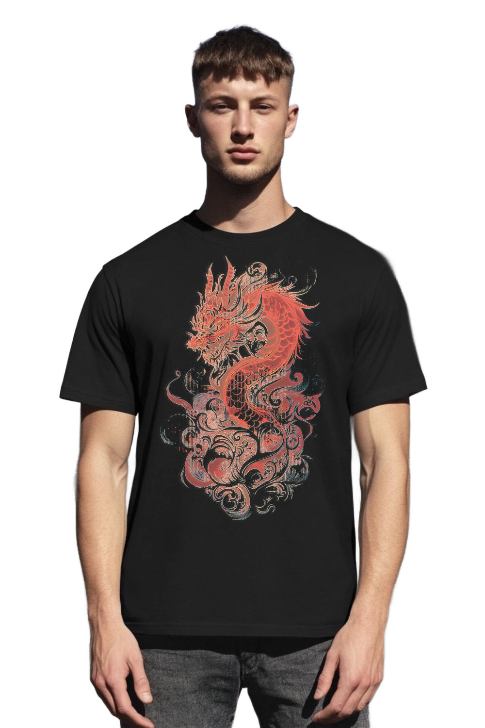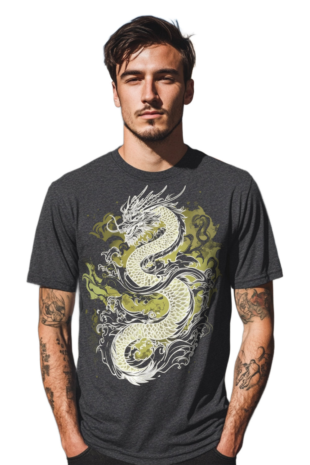 This t-shirt features a detailed linework illustration of a dragon moving through swirling waves. The...