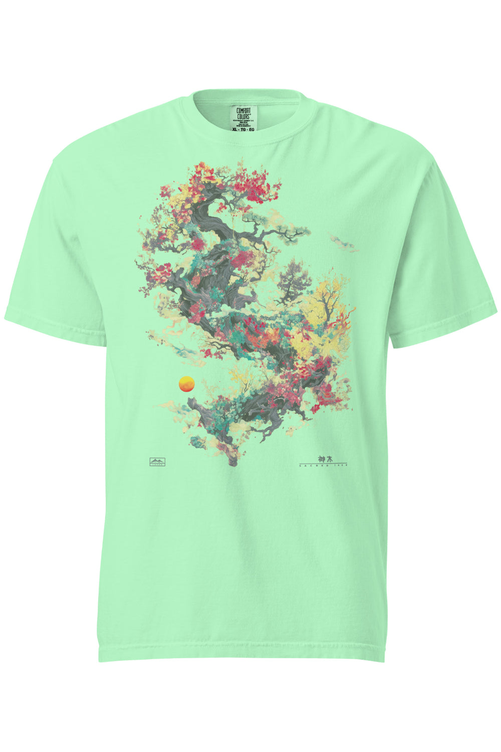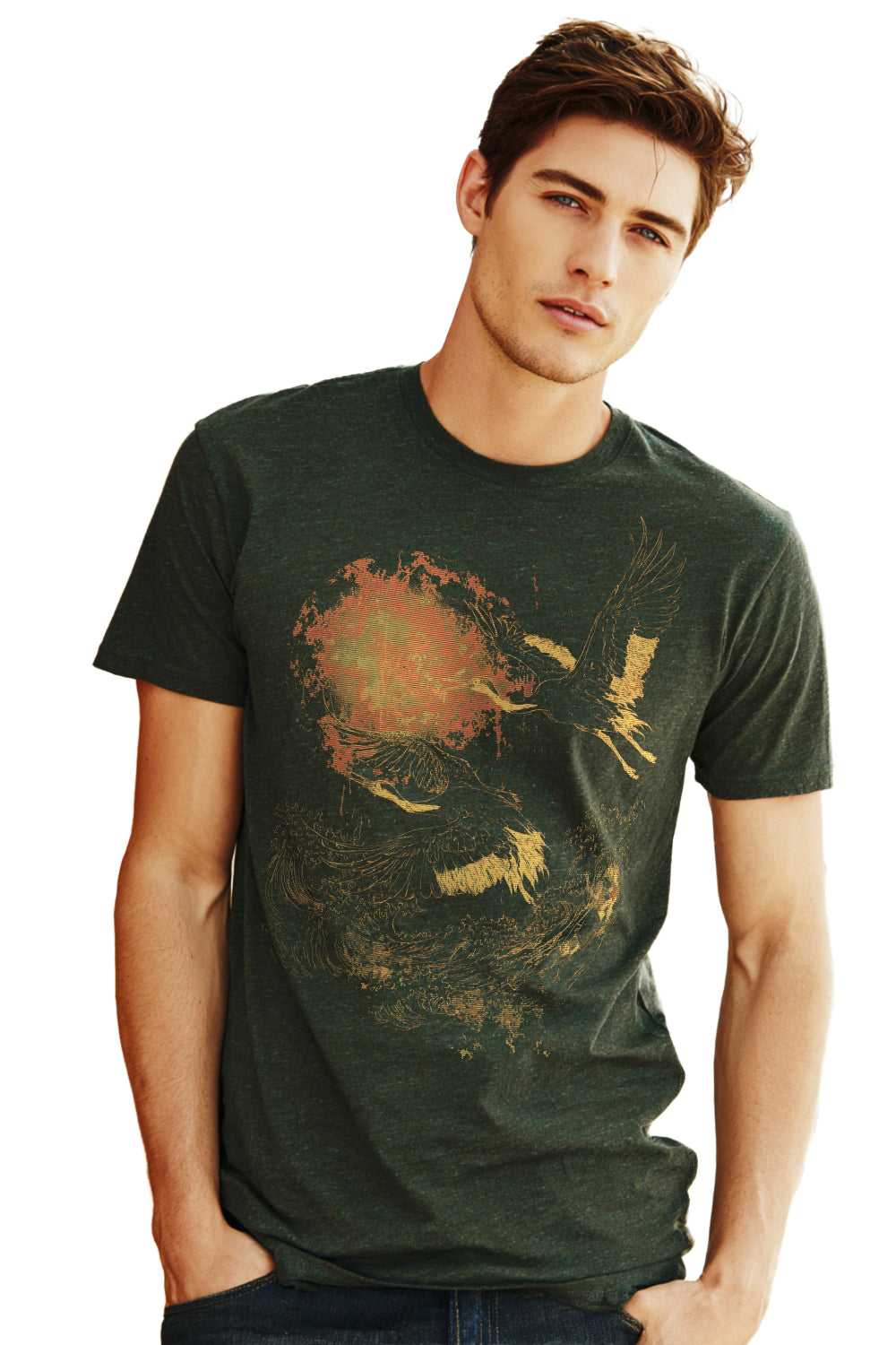 Our "Cranes" tee features two elegant birds mid-flight, circling a warm red sun against a...
