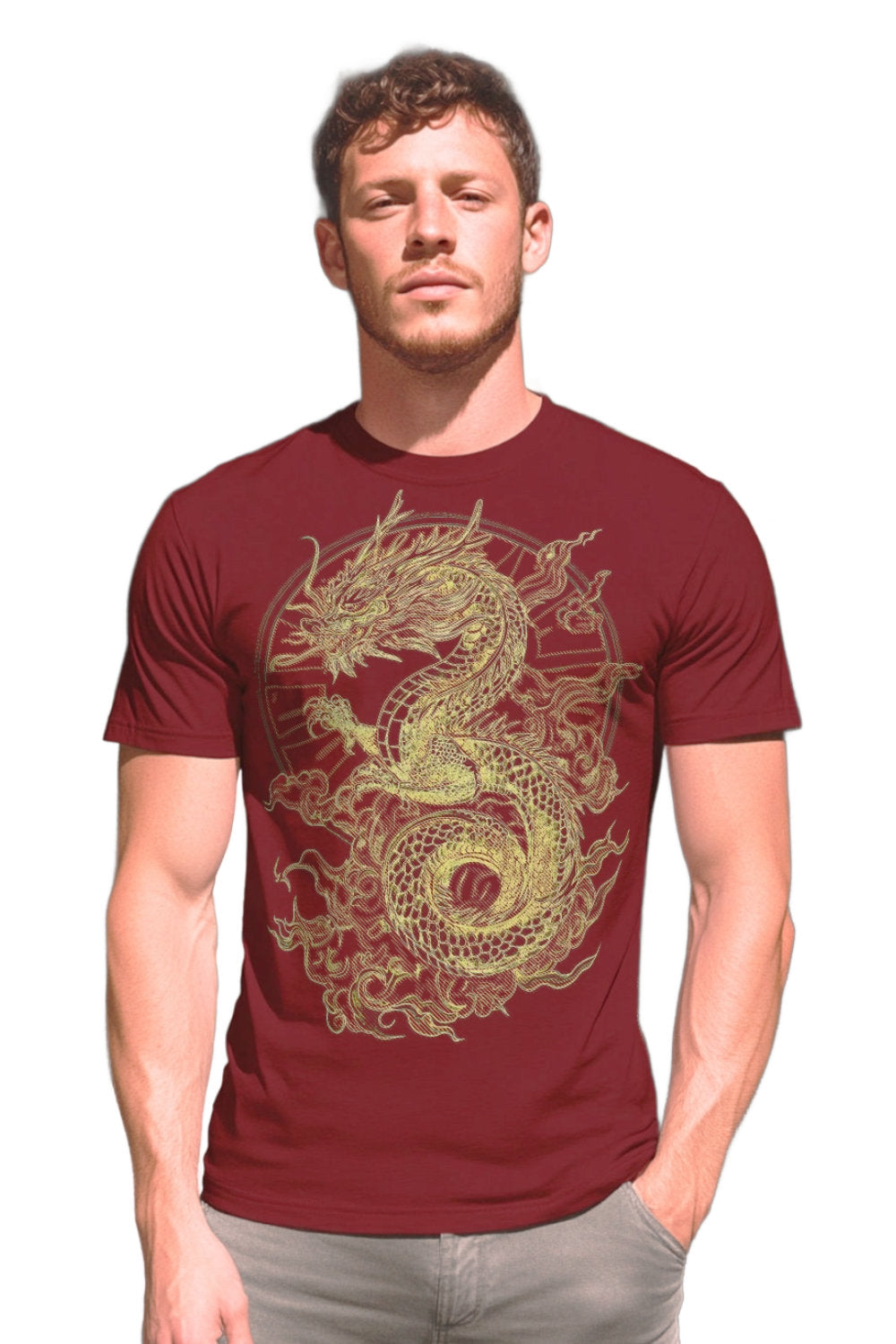 The Golden Dragon design wraps around the chest with detailed linework and a fiery orange-gold...